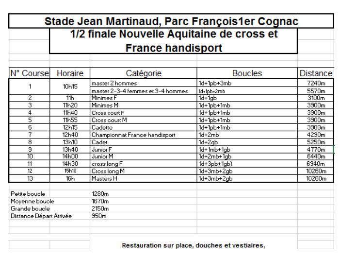 Les 1/2 finales des Championnats de France de cross de Nouvelle Aquitaine sont finalement reportées au dimanche 12 février à Cognac (Stade Martinaud).